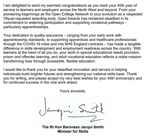 We are proud to share a letter received from Jacqui Smith, Minister for Skills in the Department for Education congratulating Open Awards on our 45th anniversary.